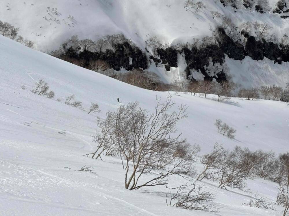 帰りは夏道を少し滑り、途中からポンショカンベツ川に向かって滑りました。良く走る気持ちのいいザラメ雪を堪能することができ一同ご満悦。