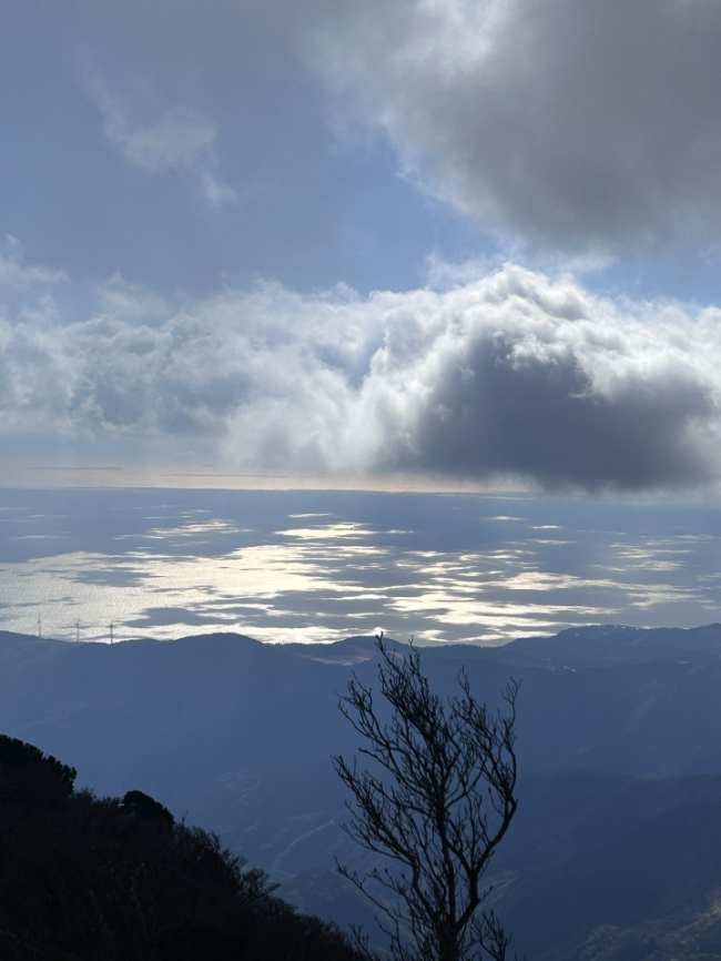 万二郎岳に向かって少しずつ高度を上げると相模湾が顔を出します。日差しに照らされた海面と、雲が落とす影が斑らに混ざり合い、大自然のアート作品のよう。