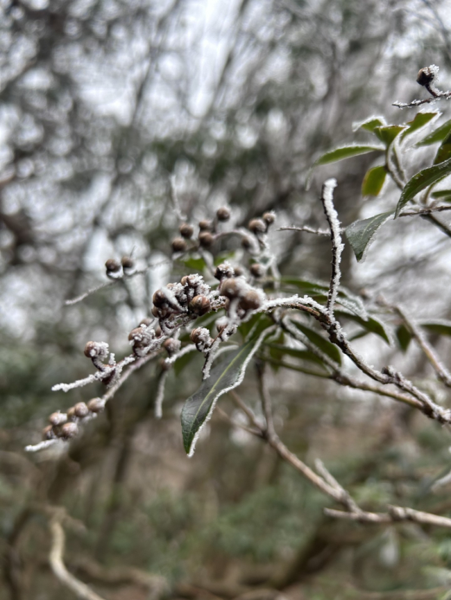 心配しながら進むと、やがて幻想的な霧氷のトンネルに。静かに固く蕾を閉じた枝が、コールドスリープ中。