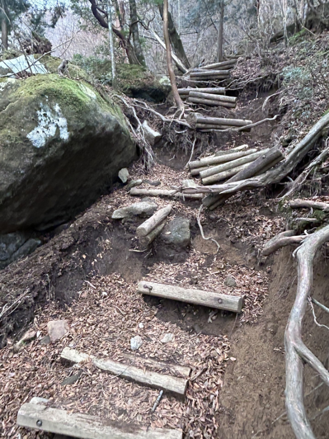 シャクナゲコース(万三郎岳遊歩道)を下ったのですが、なんだか階段崩落してるし、急傾斜だしで、ちょっと大変だぞ?
