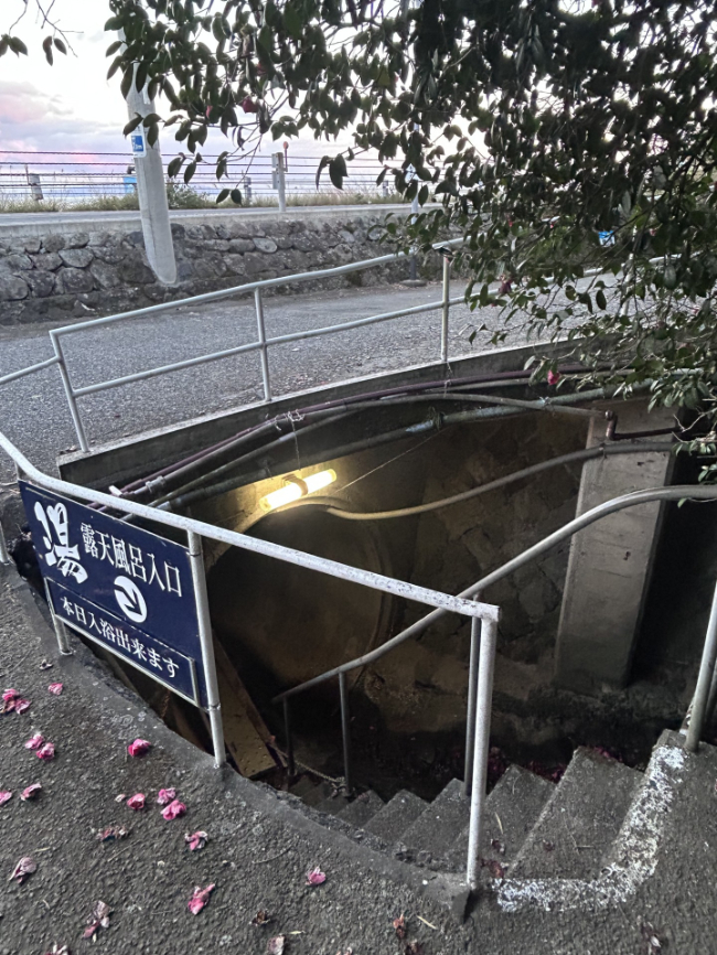 トンネルとゆうか土管の先には、大海原と美しく夕陽に染まる空。絶景のロケーションの露天風呂がありました。