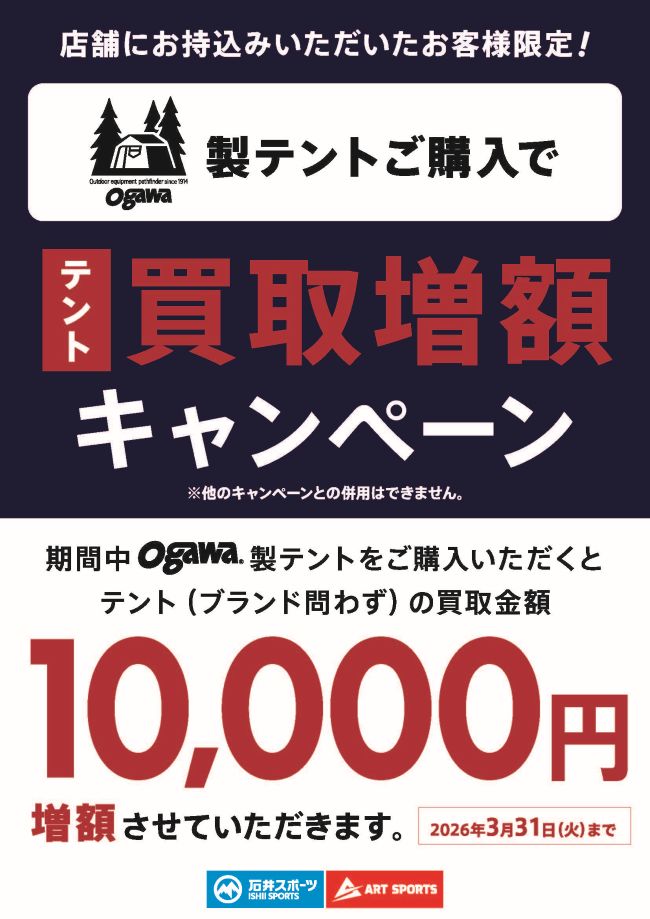 買替施策期間中、ogawaテントを購入いただくと、ブランド問わずテントの買取価格+10,000円増額。