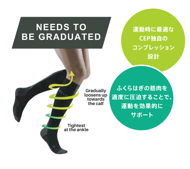 CEPでは身体の中心から離れた足首にもっとも着圧をかけ、そこから身体の中心に向かって徐々に弱まる設計となっています。