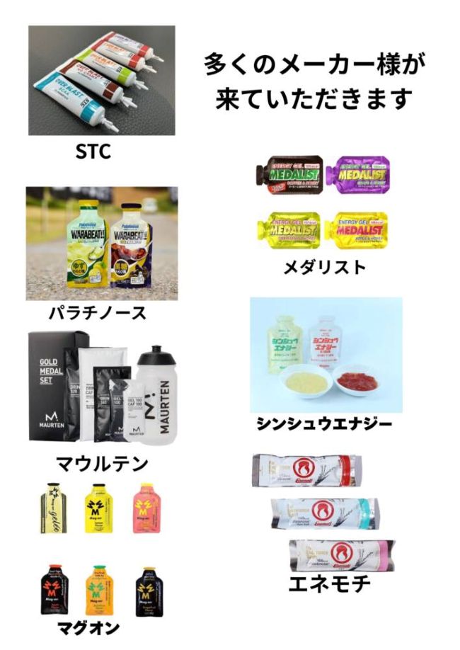 STC・メダリスト・パラチノース・シンシューエナジー・マグオン・マウルテン・エネモチと様々なメーカーのジェルや補給食を試飲して効果をメーカースタッフから、しっかりとお話を聞きながら購入できるイベント。